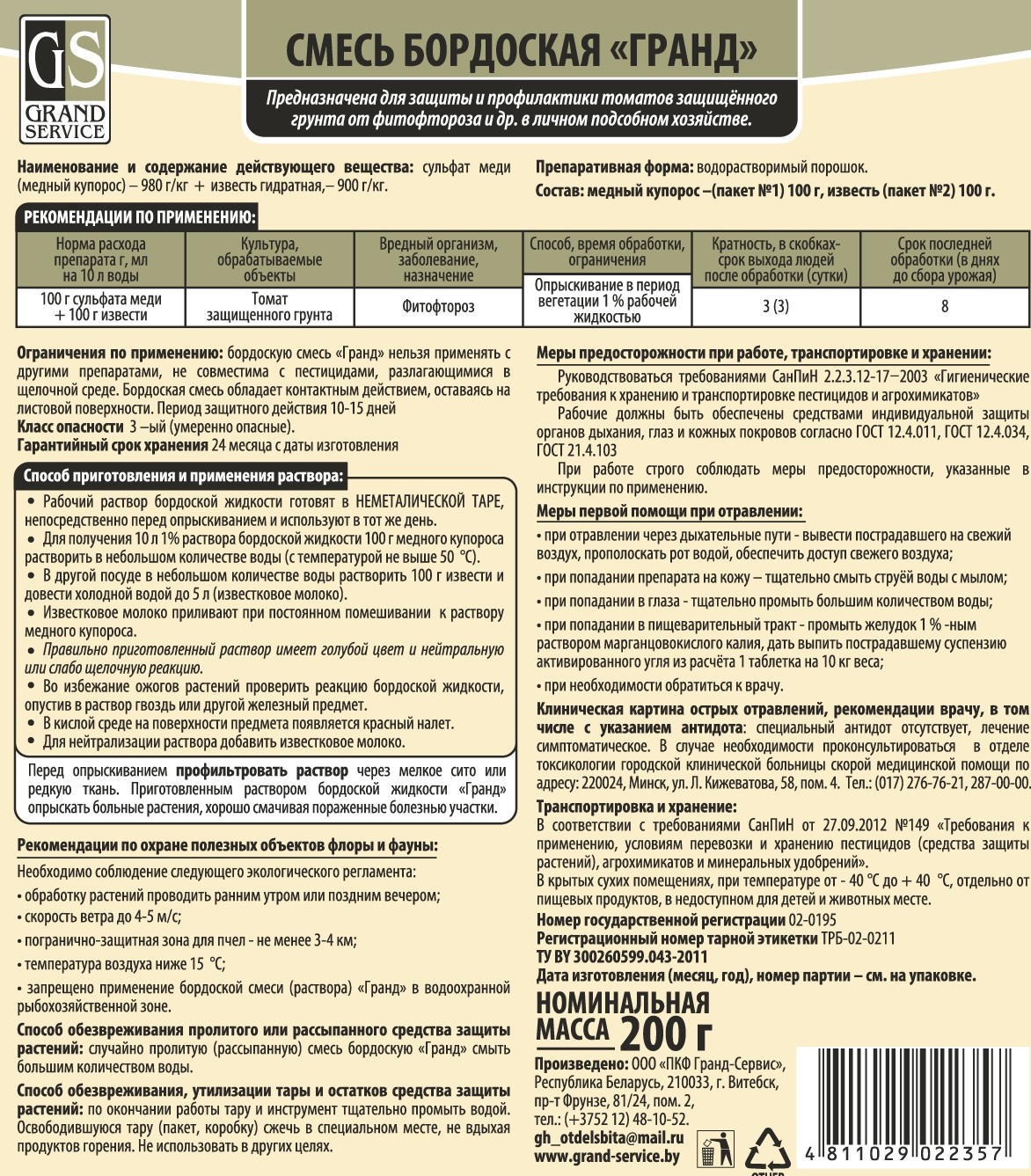 Смесь бордоская «Гранд» предназначена для защиты и профилактики томатов защищённого грунта от фитофтороза и др. в личном подсобном хозяйстве